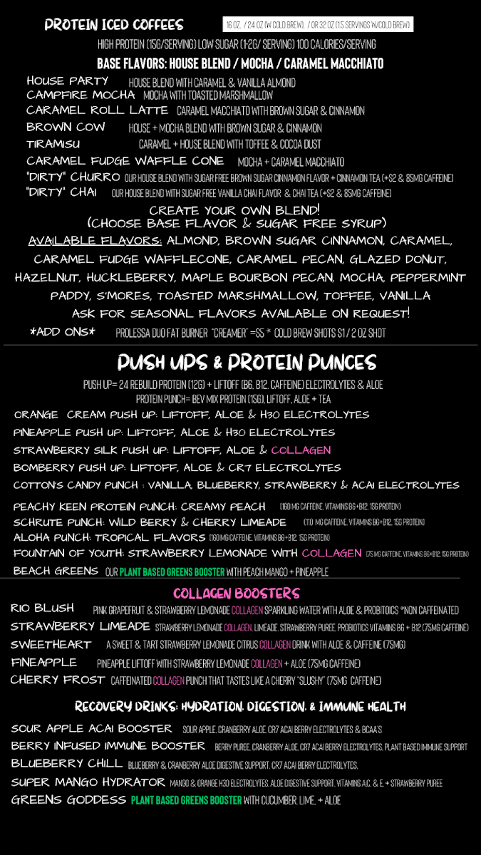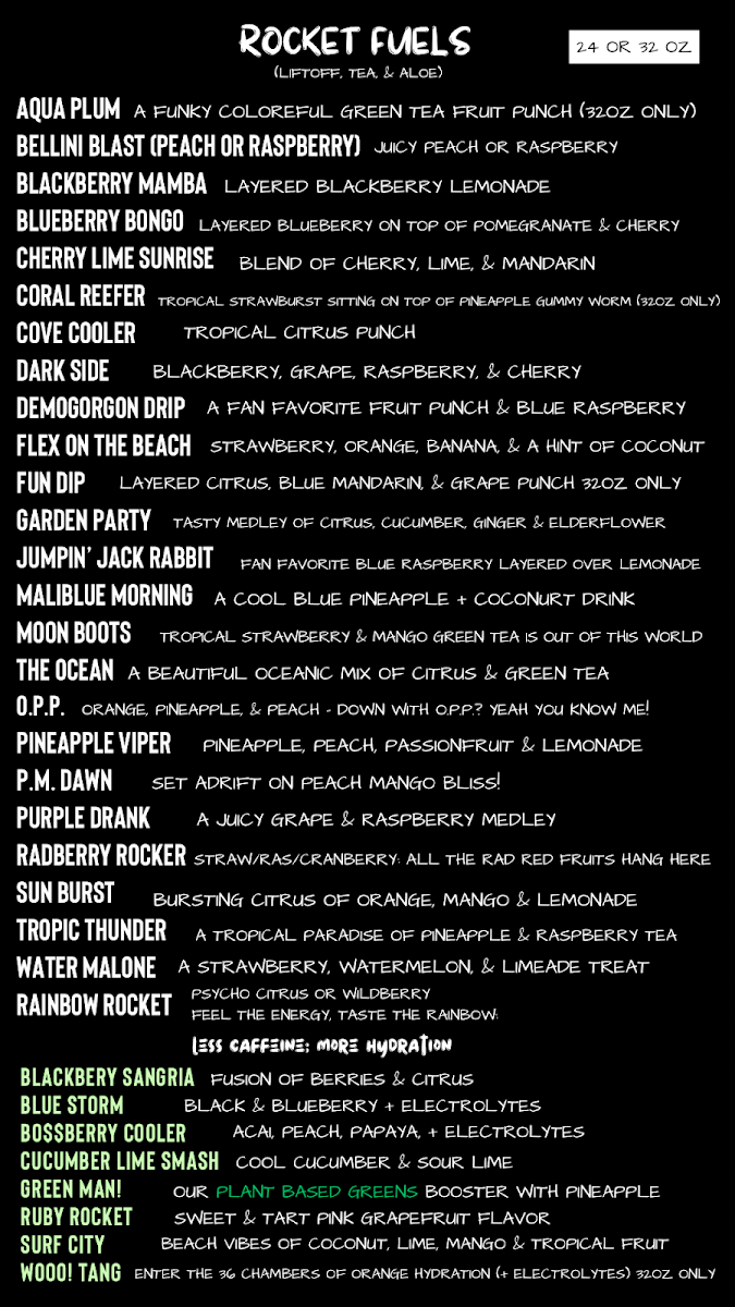 - Teas & Rocket Fuels: Enjoy invigorating sugar-free teas and energizing Rocket Fuel Energy drinks that are both refreshing and guilt-free.