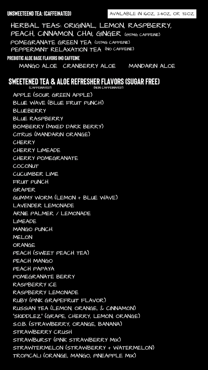 A variety of caffeinated and non caffeinated drinks. Low to no sugar, vitamin rich, and delicious!